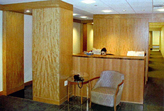 Column enclosures and wall panels of block mottled anigre contrast with the executive receptionist's desk of quartered Pearwood. The base and ceiling mouldings are of plain anigre throughout this telecom-marketing corporation in Midtown Manhattan.